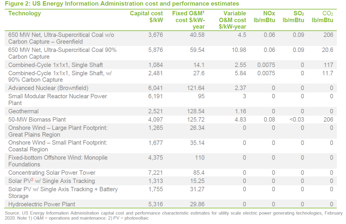 Figure 2, which is based on data for the US, shows the costs of producing electricity for various forms of generation and the associated production of greenhouse gases.