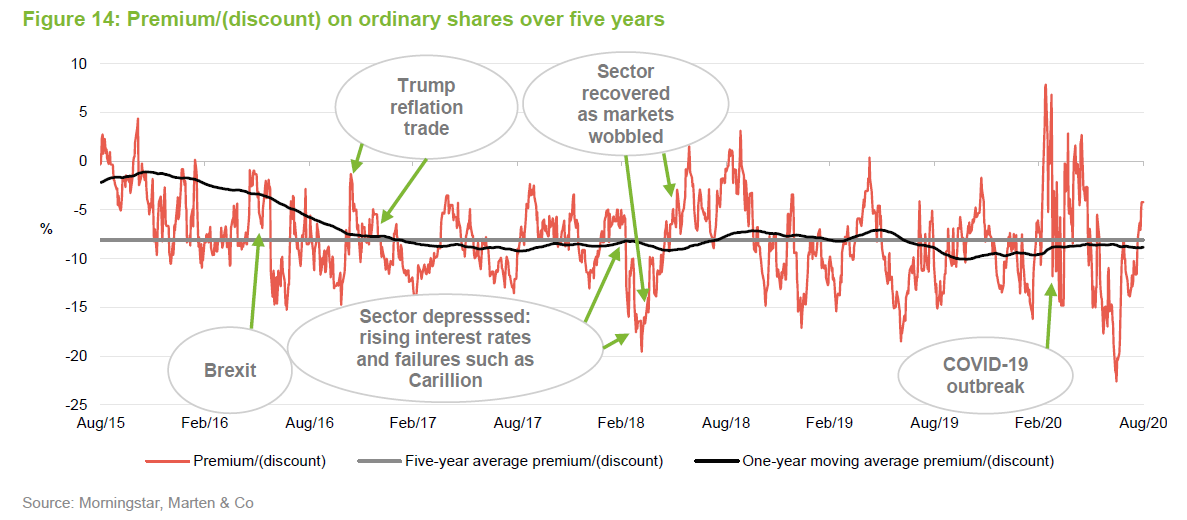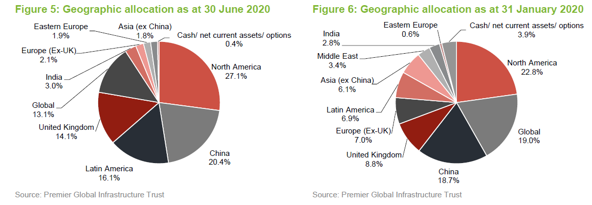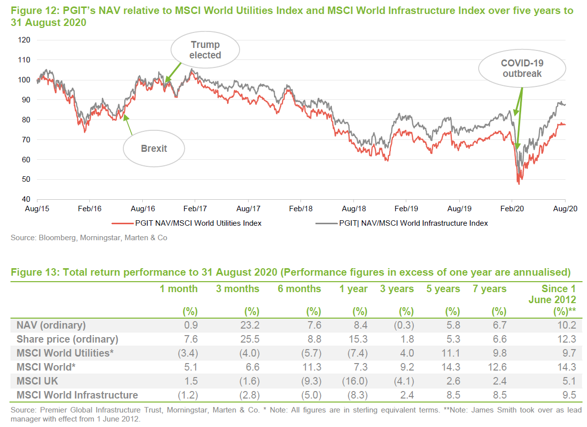 As noted above, whilst PGIT began the year well, it suffered heavily as markets rolled over in the face of the pandemic. However, its portfolio outperformed global infrastructure through a combination of strong performances in some of its larger renewable energy holdings and a level of market hedging taken out during the downturn (as markets began to fall in February the manager put some partial portfolio protection in place via short index futures, which made a £2.6m profit for the trust). PGIT’s manager says that the advent of covid-19 largely accelerated trends seen in recent years (for example, the out-performance of growth over value, weakness in both the UK stock market and sterling, and concerns over the financial stability of Europe and the Euro) while Asia, with its more recent experience of tackling pandemics, has been less disrupted than the west.