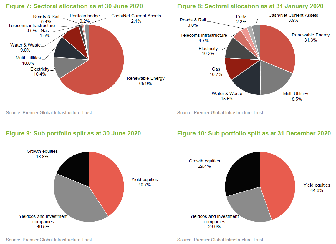 The major difference, however, is the marked increase in the allocation to renewables, which is illustrated by comparing Figures 7 and 8. As at 30 June 2020, PGIT’s allocation to renewables accounted for 65.9% of its portfolio, up from 31.3% as at 31 January 2020. This shift reflects the manager’s decision to use the opportunity presented by the market dislocation to markedly increase the portfolio’s exposure to renewable energy assets while these were at compelling valuations, as noted on page 2. As illustrated in Figures 9 and 10, the increased exposure to renewables has led to a material shift in the balance of investment between yield equities, growth equities and yieldcos. In summary, PGIT’s exposure to yieldcos and investment companies has increased. This has largely been funded through a reduction in growth equities, along with a more modest reduction in yield equities.