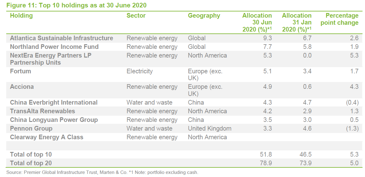Figure 11 shows PGIT’s top 10 holdings as at 30 June 2020 and how these have changed since 31 January 2020 (the most recently available data when QuotedData last published). The changes, which are summarised below, largely reflect the shift towards renewables. Specifically: