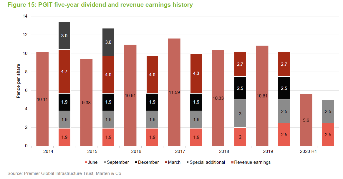 As noted above, PGIT’s revenue income was down by 9.8% year-on-year for the first half of 2020. PGIT’s manager says that the primary cause of this was dividends from National Grid and China Suntien Green Energy that did not materialise in the first half as had been expected. National Grid’s final dividend for its March 2020 year went ex-dividend in early July (as opposed to June in previous years) and will be accounted for in the Trust’s second half (this dividend has already been received).