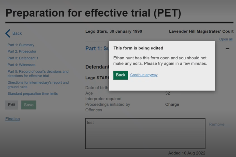 2. If someone else is already editing the form, you will see a pop-out message. You should select ‘Back’ and try again later. The form will unlock one hour after the last edit if the person editing forgets to save when they have finished.