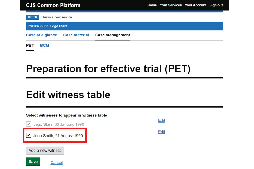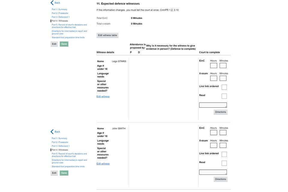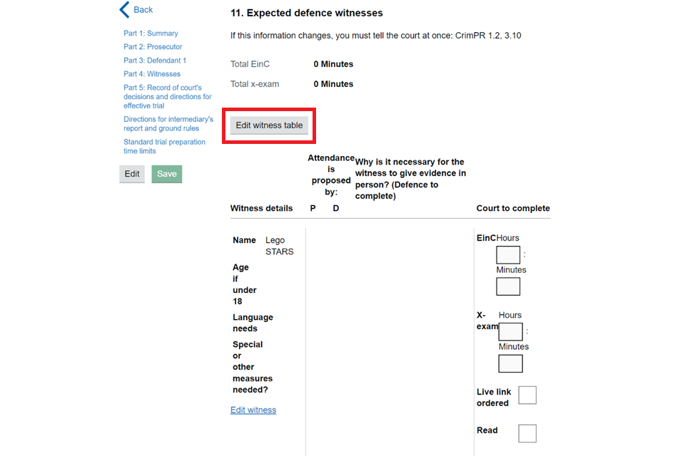 1. To add or edit a witness, do not select the ‘Edit’ button, as with other sections. Instead, open the witnesses section, scroll to ‘Expected defence witnesses’ and select ‘Edit witness table’.