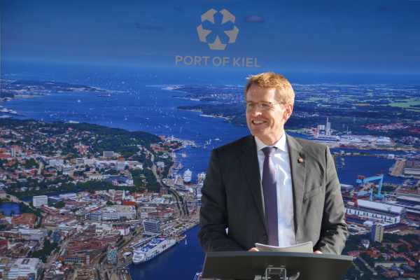 The State Premier of Schleswig-Holstein, Daniel Günther, visited the Ostufer-hafen on 12th August to hand over the grant notice coming from the State Programme Economy for 5.44 million Euros: “Located on the interface between continental Europe and the Baltic Sea Region the ports of Schleswig-Holstein are an integral part of European transport chains. With its modern and efficient port infrastructure the port of Kiel contributes to strengthening Germany’s competitive ability and increasing the growth potential of our economic area”, said Minister-President Günther.