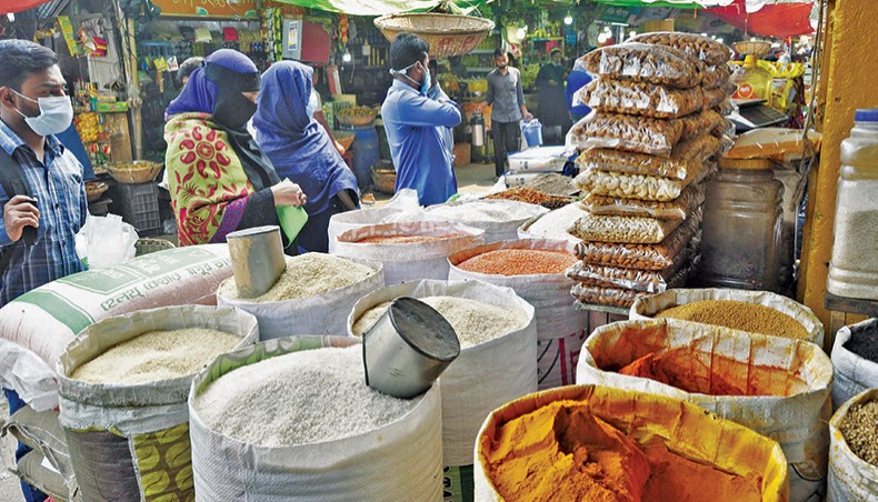 A file photo shows people buying essential commodities, including rice and red lentil, at a grocery store at the Karwan Bazar kitchen in the capital. The prices of rice, edible oil, red lentil and broiler chicken increased on the kitchen markets in the capital over the week ending on Friday. — Focus Bangla photo