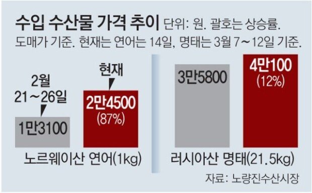 Third week into Russia’s invasion of Ukraine, the prices of imported marine products, including salmon and Pollack, are soaring. Norwegian salmon is mainly transported to South Korea by air via Russia but air fares have become expensive as flights are taking circuitous routes due to Russia’s airspace closure. As for Russian pollack, South Korea is relying on frozen stockpiles due to restrictions on deep-fishing and import payments.