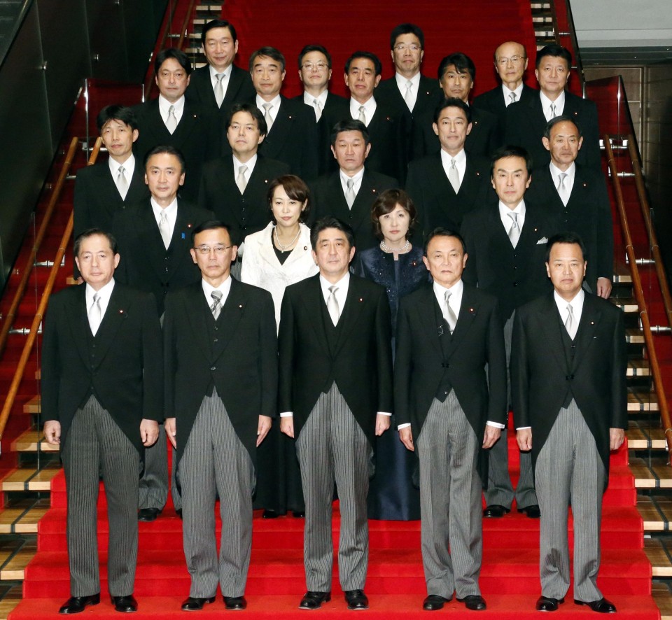 File photo taken in December 2012 shows Japanese Prime Minister Shinzo Abe (C, front row) and members of his Cabinet at the prime minister’s office in Tokyo. Abe will step down from his post due to health concerns, a source from his Liberal Democratic Party said on Aug. 28, 2020. (Kyodo)