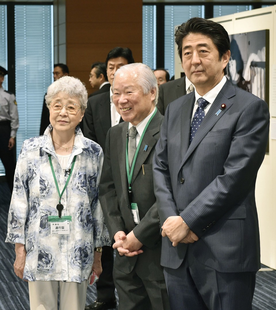 File photo taken in June 2014 shows Japanese Prime Minister Shinzo Abe (R) posing for a photo with the parents of Megumi Yokota who was abducted by North Korea in 1977 at age 13 at a photo exhibition featuring their daughter in Tokyo. Abe will step down from his post due to health concerns, a source from his Liberal Democratic Party said on Aug. 28, 2020. (Kyodo)