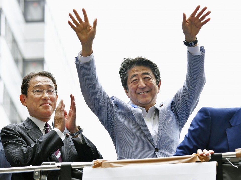 Japanese Prime Minister Shinzo Abe (R) waves alongside Liberal Democratic Party policy chief Fumio Kishida during a House of Councillors election campaign in Hiroshima on July 14, 2019. (Kyodo)
