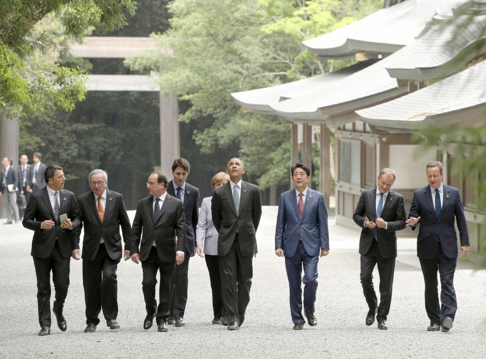 File photo taken May 26, 2016, shows Japanese Prime Minister Shinzo Abe (3rd from R) visiting Ise Jingu shrine in the central Japan city of Ise with other leaders of the Group of Seven major economies. The prime minister will step down from his post due to health concerns, a source from his ruling Liberal Democratic Party said Aug. 28, 2020. (Kyodo)