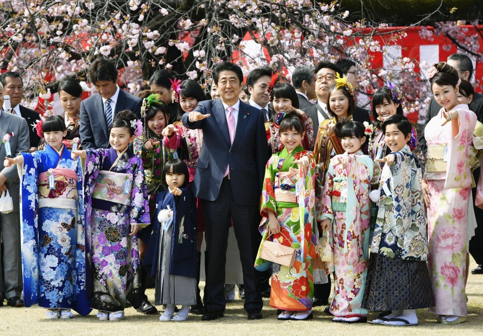 File photo taken in April 2016 shows Japanese Prime Minister Shinzo Abe (c) posing with guests invited to a cherry blossom-viewing party at Shinjuku Gyoen National Garden in Tokyo. Abe will step down from his post due to health concerns, a source from his Liberal Democratic Party said on Aug. 28, 2020. (Kyodo)