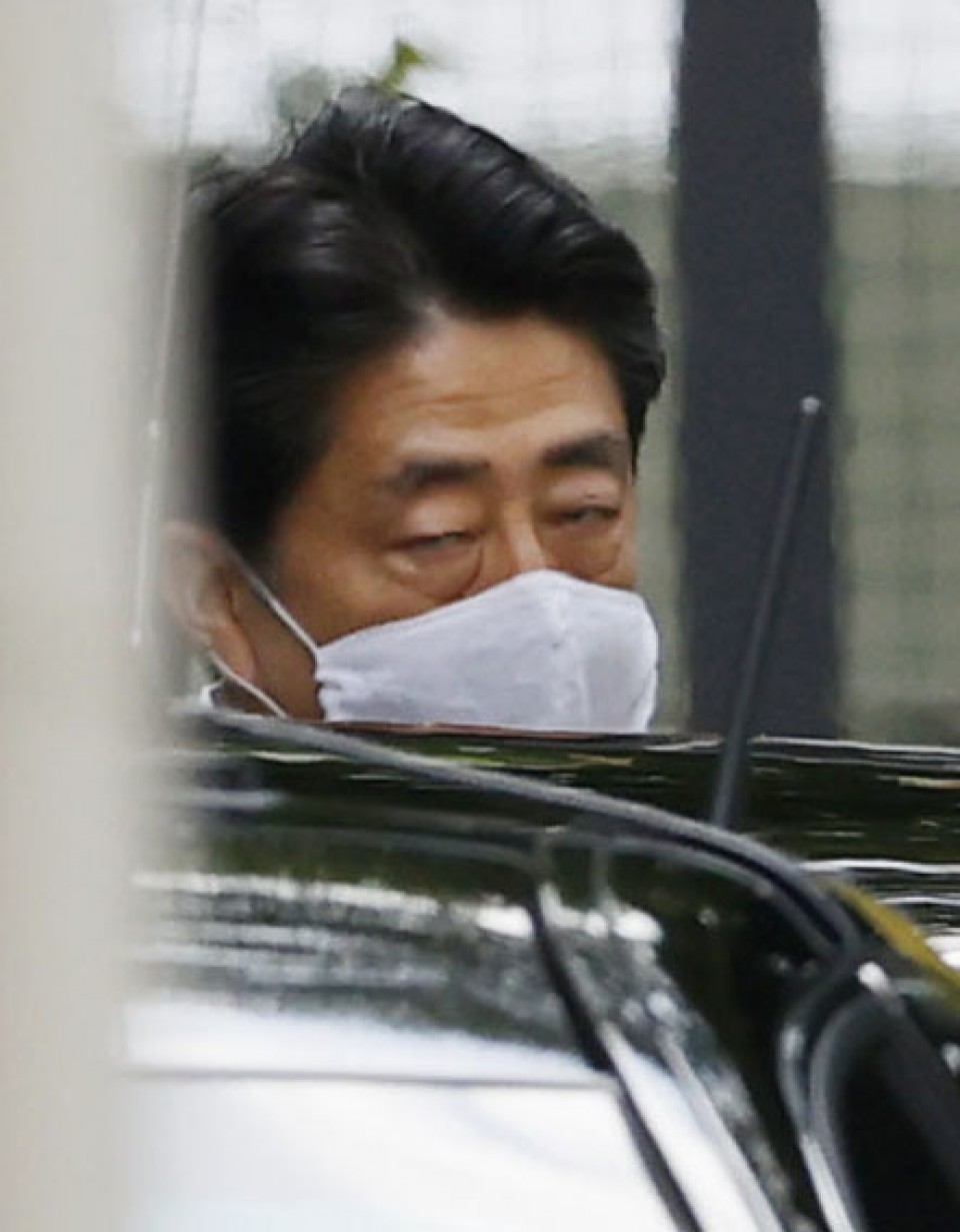 Japanese Prime Minister Shinzo Abe leaves Keio University Hospital in Tokyo on Aug. 24, 2020. Abe revisited the hospital where a week ago he underwent what an aide called “a regular health checkup” amid speculation about his health. (Kyodo)