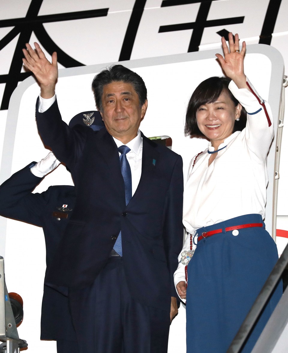 File photo taken in August 2019 shows Japanese Prime Minister Shinzo Abe and his wife Akie preparing to board a plane in Bordeaux, France, after Abe attended a Group of Seven summit. Abe will step down from his post due to health concerns, a source from his Liberal Democratic Party said on Aug. 28, 2020. (Kyodo)