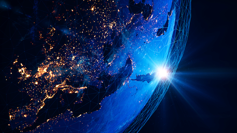 Earth view from space at night with lights and connections from cities.