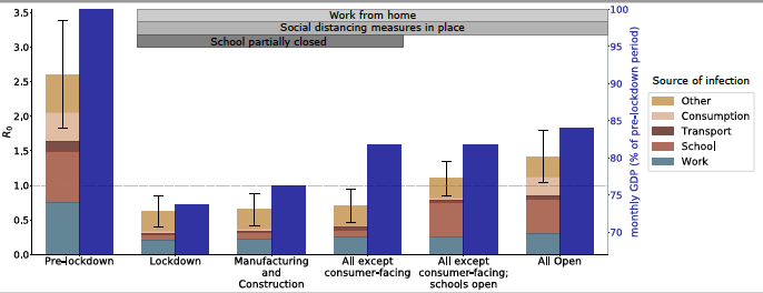 By splitting sources of infection by economic activity, we can assess both the economic and epidemic impact of different scenarios.