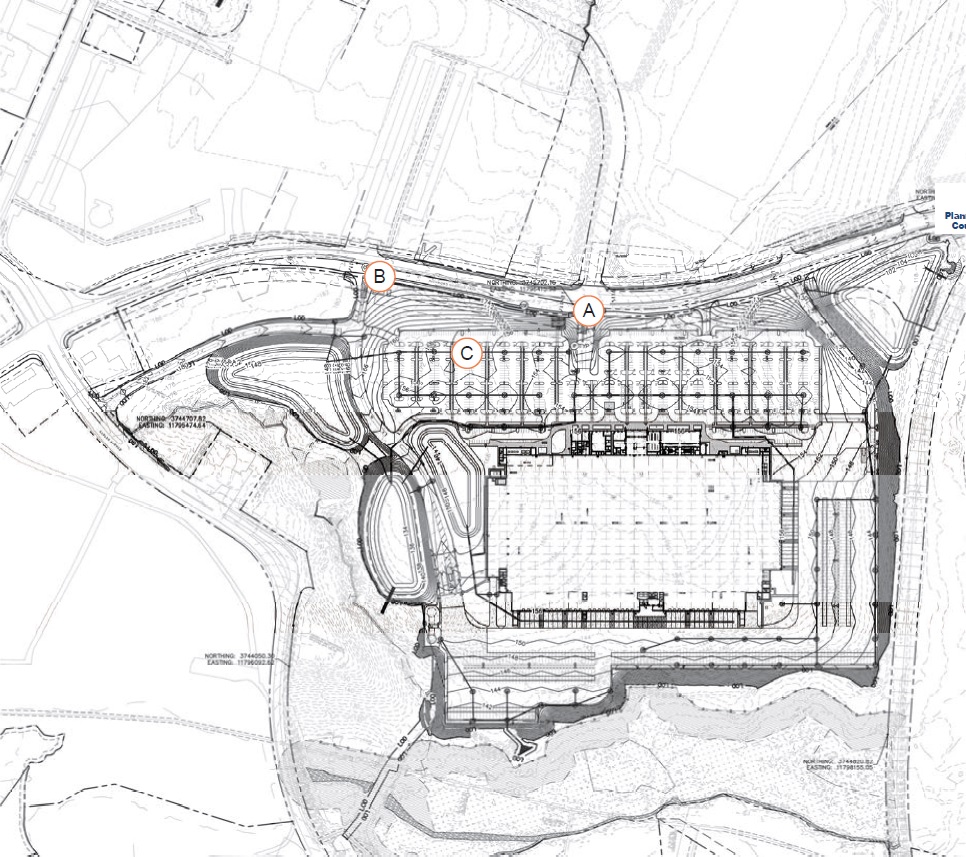 The five-story structure is based off of a 650,000-square-foot footprint and will reach 100 feet at its highest point, plans show. A parking lot is planned between the building and the turnpike, which is being improved along the site.