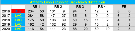 Lynn is not as strict with his touch distribution as the Saints and will occasionally use his third back more often. In 2016, he had the NFL’s leading rusher in LeSean McCoy and rode the hot hand. In his first year in L.A. (2017), he had an established rusher in Melvin Gordon but little depth behind him other than undrafted rookie Austin Ekeler. When Ekeler proved himself reliable, Lynn shifted into a two-back system (similar to the Saints) during the 2018 and 2019 seasons. In 2020, Lynn once again had an established starter (Ekeler) and an unproven rookie, but this time he tried to keep a two-back focus. When Ekeler was injured, RB3 Kalen Ballage’s snaps increased briefly.