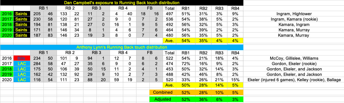 When we line up the two charts side-by-side, find the distribution averages, and blend them, we get a “Combined” look at how the Lions could potentially distribute touches this season. Going a step further, we can eliminate the seasons where Lynn featured just the primary back (2016-2017) and the one where the primary back was injured (2020) to get an “Adjusted” average that focuses on just the seasons where two backs were heavily utilized.