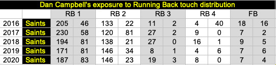 When looking at the Saints running back touch distribution over the last five years, they have consistently run a two-back system. They give their top running back roughly 50-55 percent of touches and the complementary running back 31-39 percent of touches, spreading the last 10 percent over multiple players.