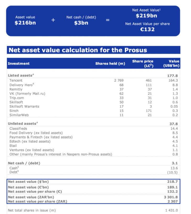 Because Prosus is an investment company, its share price will have some sort of variance to its net asset value (NAV). When I invest in investment conglomerates (and I do, over 9% of my portfolio is allocated to several of them), I do so on the basis of NAV taking center stage here.