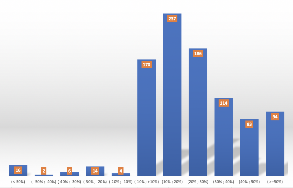 It is important to note that the vast majority of contract changes resulted in increases in public spending. For the most part, they remain contained at increases of less than 20% of the amount of the contracts. However, some lead to substantial increases in the contract amounts, of more than 50%.