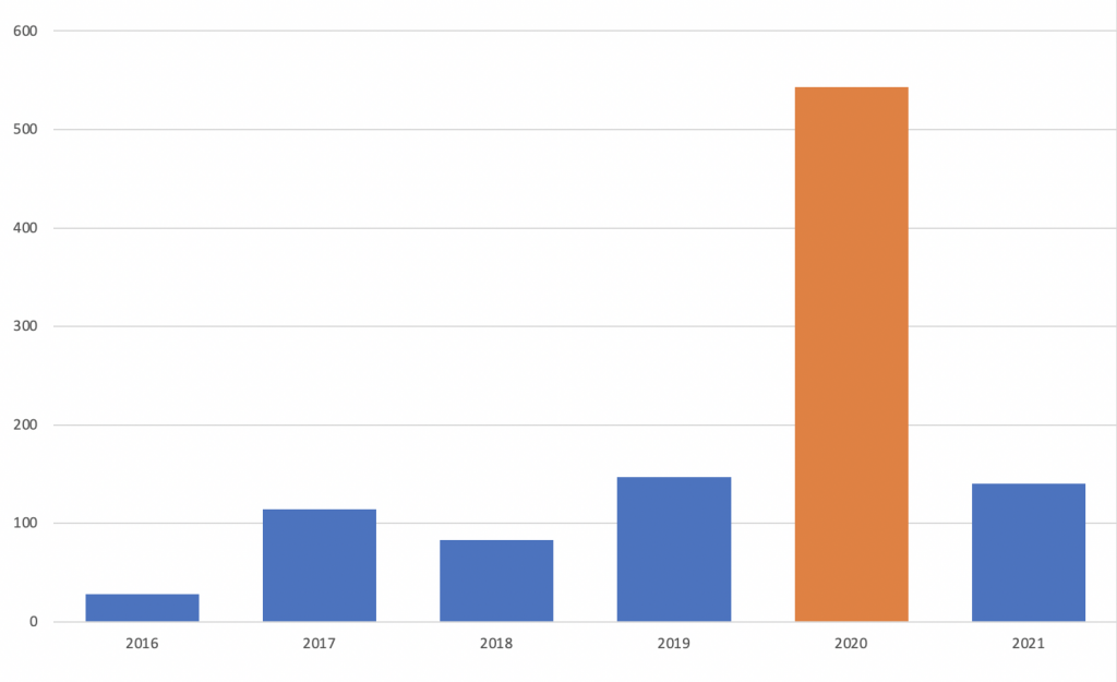 Figure 2: Number of renegotiated UK contracts per year (January 2016 – May 2021).