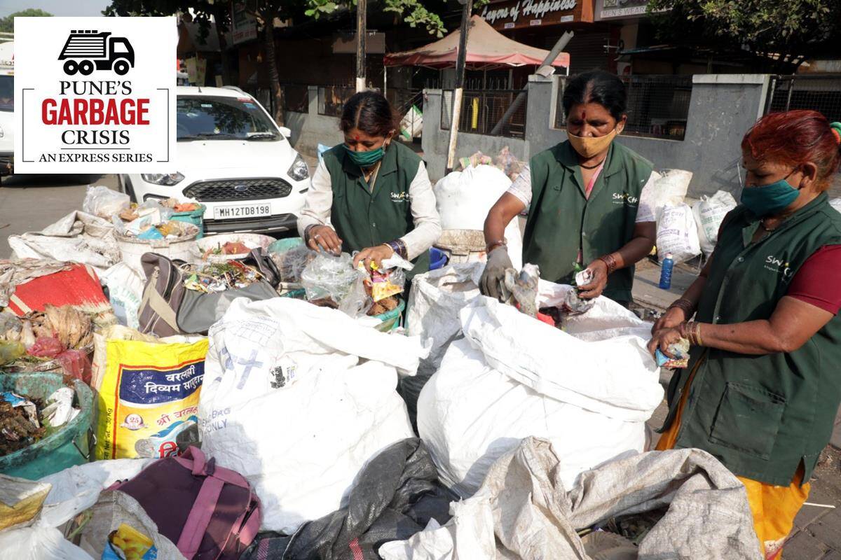 Even dust, and what is termed as non-recyclable, finds its way into brick kilns or construction waste recycling machines to come out as new useful material. At a sorting shed in Wanawadi. Express Photo by Arul Horizon