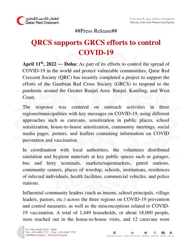 April 11th, 2022 ― Doha: As part of its efforts to control the spread of COVID-19 in the world and protect vulnerable communities, Qatar Red Crescent Society (QRC) has recently completed a project to support the efforts of the Gambian Red Cross Society (GRCS) to respond to the pandemic around the Greater Banjul Area: Banjul, Kanifing, and West Coast.