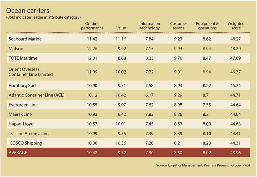 This year, Seaboard Marine and Matson led the way, putting up nearly identical weighted scores, while the attribute category scores were fairly well balanced throughout. Matson put up top marks in On-time Performance (12.26); Seaboard scored tops in Value (11.16); Tote Marine scored a category leading 8.23 in Information Technology; Matson topped Customer Service with a 9.94; while Orient Overseas and Matson put up identical 8.94 scores in Equipment & Operations.