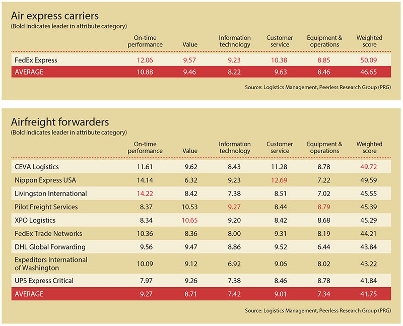 Cargolux posted top marks in the Information Technology attribute (8.93), while KLM put up a notable 9.95 in Customer Service to lead the way in this important attribute category this year. FedEx Express was the only carrier to score above the weighted average this year in the Air Express Carriers category, posting an impressive 50.09 total weighted score.