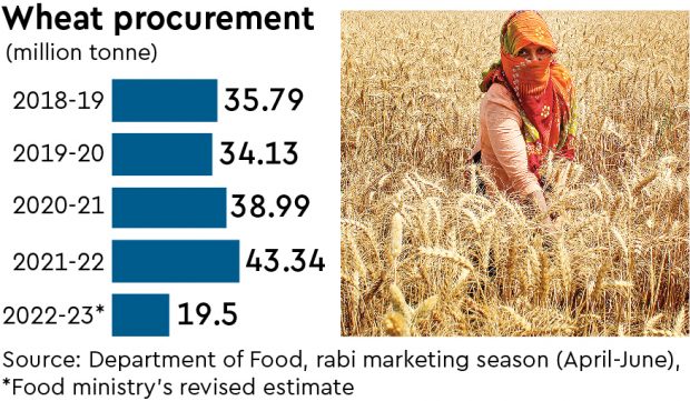 Last week, food secretary Sudhanshu Pandey had said the lower wheat output, coupled with private purchase from farmers by exporters and traders holding on to the stocks, would lead to a 55% year-on-year decline in wheat procurement in the 2022-23 marketing year, to 19.5 mt. This means the purchases of the cereal by the government at MSP would hit a 13-year low this year.
