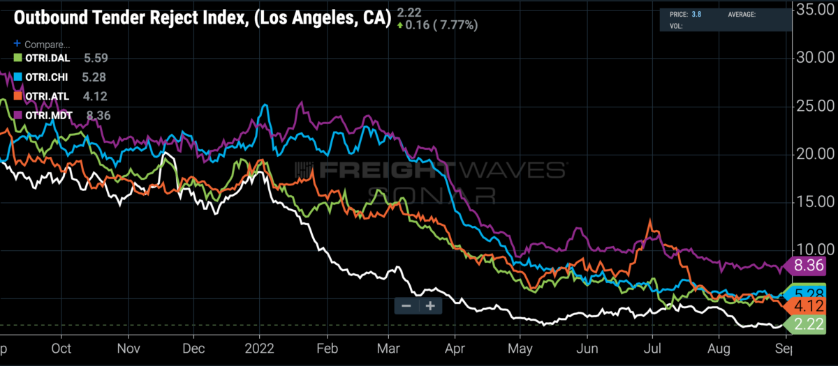 Today, the largest five trucking markets — Los Angeles, Dallas, Atlanta, Chicago and Harrisburg, Pennsylvania — all show very loose trucking capacity. Only Harrisburg (OTRI.MDT) is rejecting a significant amount of outbound freight at 8.36%.