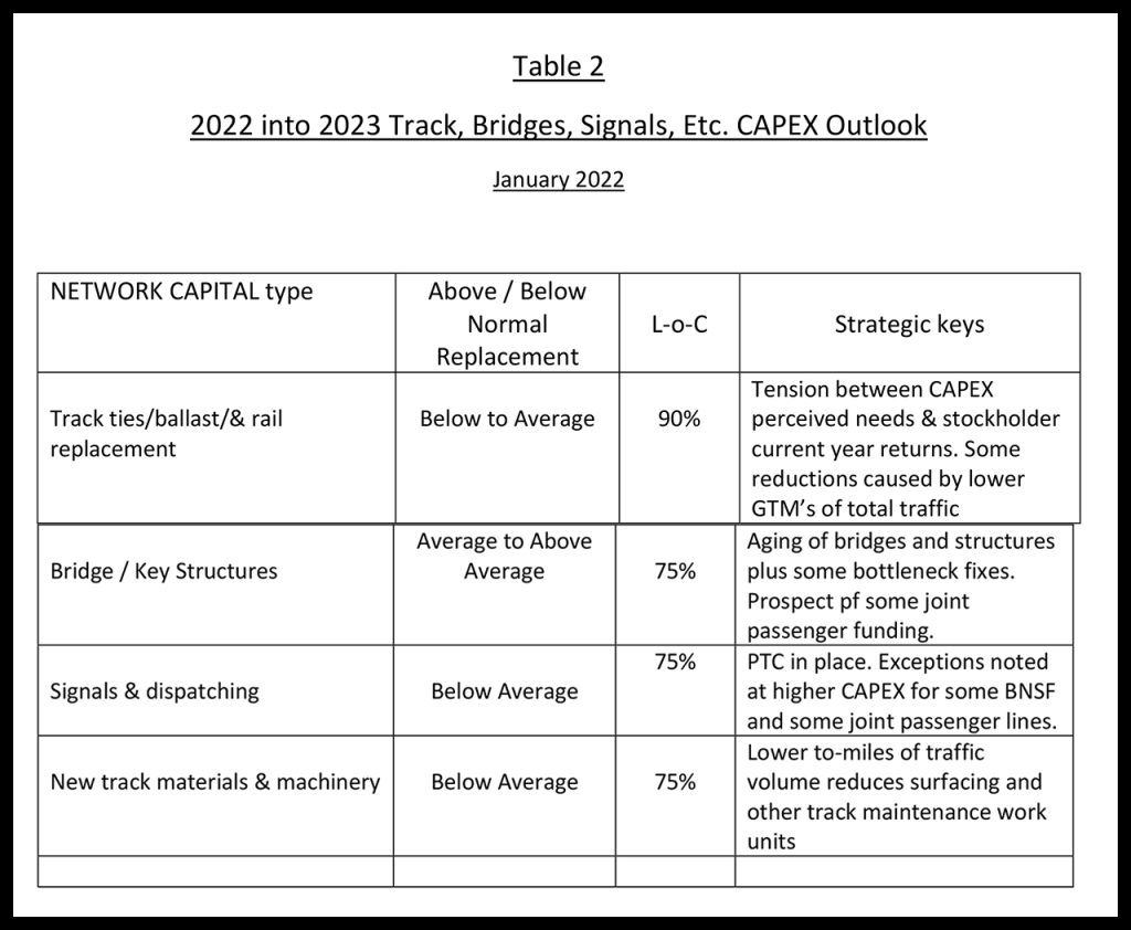 At the risk of error, by going first, allow this veteran railroad economist to set the table. Interpreting the broader economy data from sources that I respect, and based upon my experience at strategically following the rail freight industry, here is my outlook for railroad capital investment likely to be “obligated” during 2022, including locomotives, of which the market for new main line (high-horsepower) EPA Tier 4-compliant units has been virtually non-existent, with railroads choosing to rebuild and upgrade older (Tier 1-3) locos.