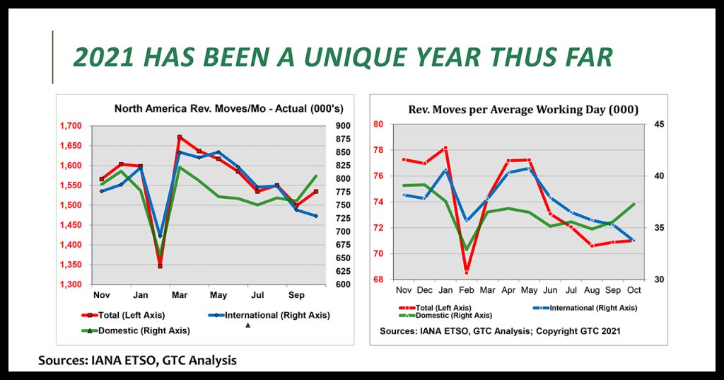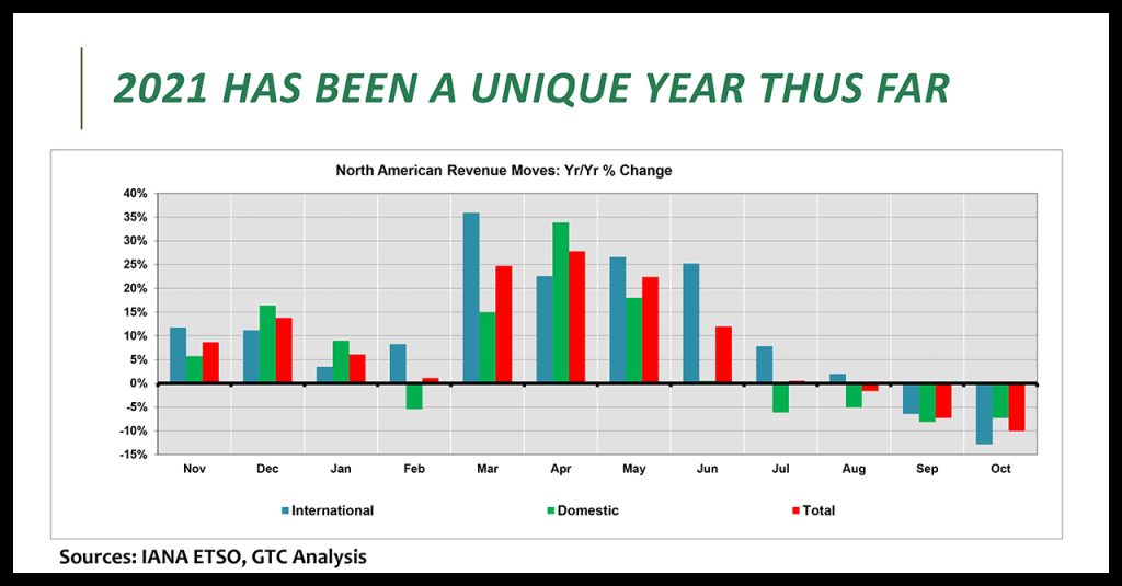 - The strongest international volumes during 2021occured in the Southwest-Southeast so called transcontinental corridors, which would include, for example, LA – Atlanta traffic routing.