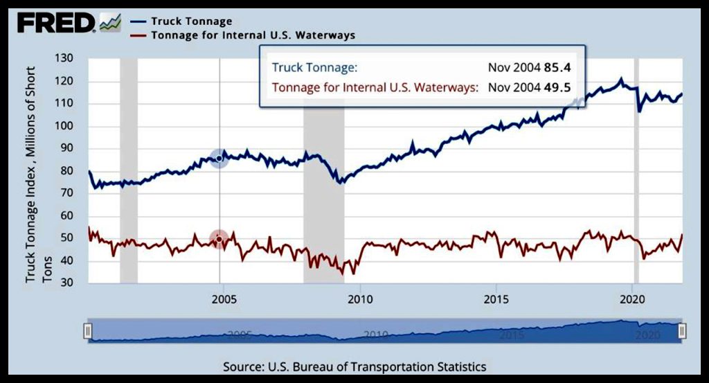 There is a same-period trend for trucking and inland water freight. In contrast, trucking has grown while inland water freight commerce has remained relatively constant, compared to the base year near 2000: