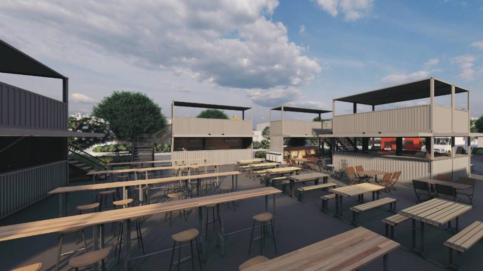 The Yard’s main kitchen will be built in the former service station, which will remain. The rest of the project will be built out of about a dozen shipping containers, some stacked, creating a corral of multiple bars, rooftops and tables.