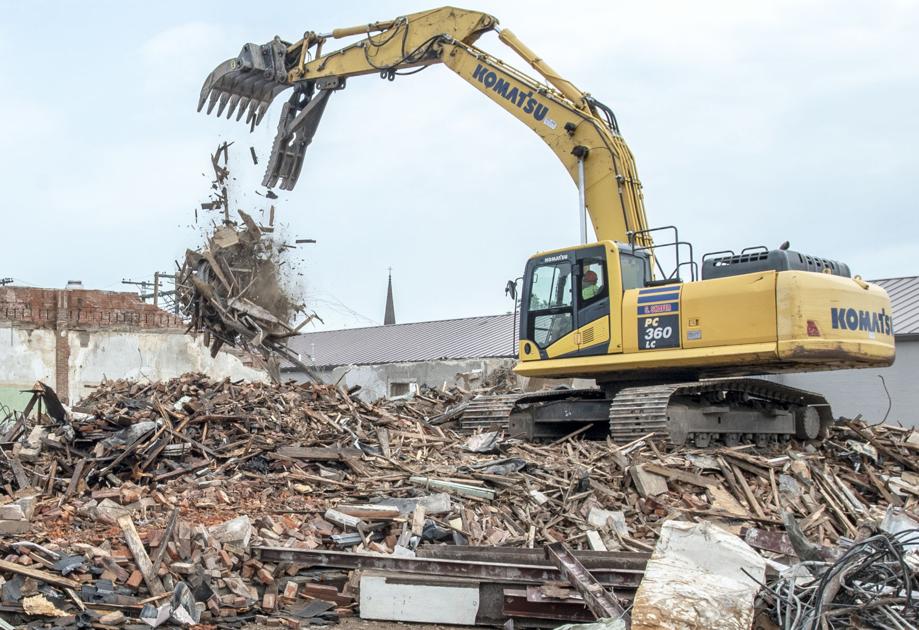 A crew for S. Shafer Excavating demolishes the historic First National Bank building Wednesday in downtown Rantoul. Built in the early 1900s, the building was condemned by the village in 2013. Resident Jill Alred recalls working in the bank and its drive-up facility around 1973, when Chanute Air Force Base was still open. ‘We were so busy on a military payday that cars would line up back to St. Malachy Church (several blocks).’ she said. ‘I ran a pretty mean calculator.’ Alred remembers being excited to get a raise, then learning it was a nickel an hour. On Wednesday, she got a brick from the old bank in memory of her first job.