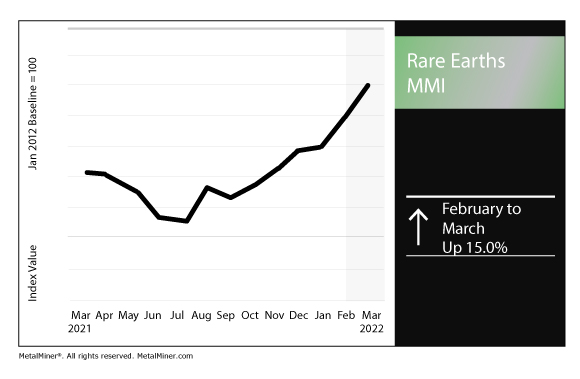 The Rare Earths Monthly Metals Index (MMI) rose by 15.0% for this month’s index value, as rare earths prices rose across the board.
