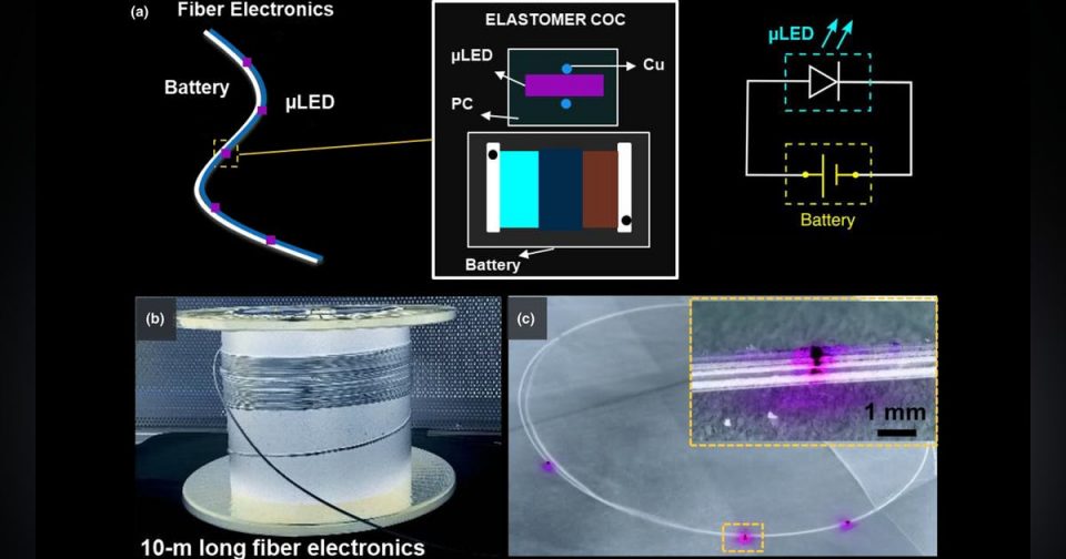 Postdoctoral student Tural Khudiyev (one of the project leaders, now an assistant professor at the National University of Singapore) noted that others have attempted to make batteries in fiber form, but those were structured with key materials on the outside of the fiber. In contrast, their approach embeds the lithium and other materials inside the fiber with a protective outside coating, thus directly making this version stable and waterproof. They also were able to embed devices such as LEDs into the drawn fiber construction (Fig. 2).