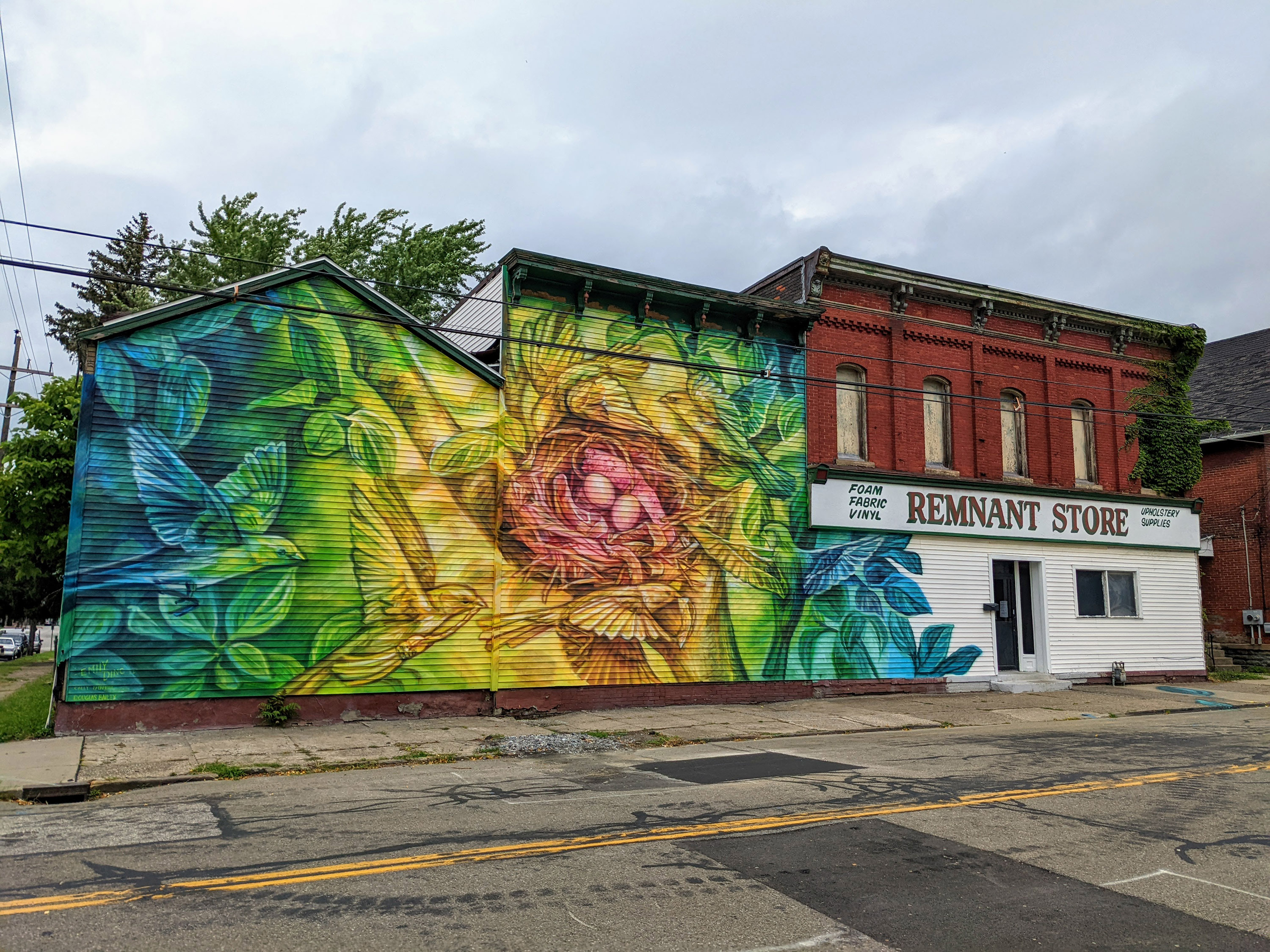 So, given that regularity, Pentz never expected that an opportunity would arise that would mean a massive change to her previously unchanged building: an Erie Arts and Culture “Purposeful Placemaking” mural that would transform what was previously a massive swath of white vinyl siding covering their building. According to the organization’s executive director, Patrick Fisher, the choice to use Pentz’s building was a natural one: “Visiting muralist Emily Ding selected the Remnant Store for the unique architecture of its front facade, even though vinyl siding is a less than ideal surface to paint on, as it poses many challenges. After Emily identified the Remnant Store as her top choice, I placed a cold call to the Remnant Store and spoke with Judie. I identified myself, provided very minimal details about the project, and quickly received an eager YES from Judie.”