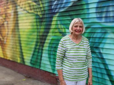 Judie Pentz, owner of the Remnant Store at 306 E 11th Street, stands before the new mural on her building. Judie’s family has owned the store since 1963 and, at age 80, she doesn’t have plans to retire anytime soon.
