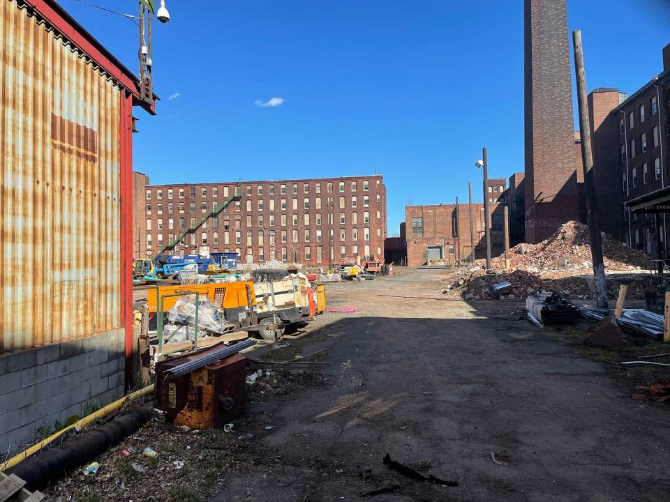 Scaffolding and cranes mark the beginning of the restoration of the Clark Thread Company Historic District, built along the banks of the Passaic River in 1875. Two buildings in the courtyard are being demolished before work begins on the facade, Kevin Catrambone, special projects manager for East Newark, told Jersey Digs.