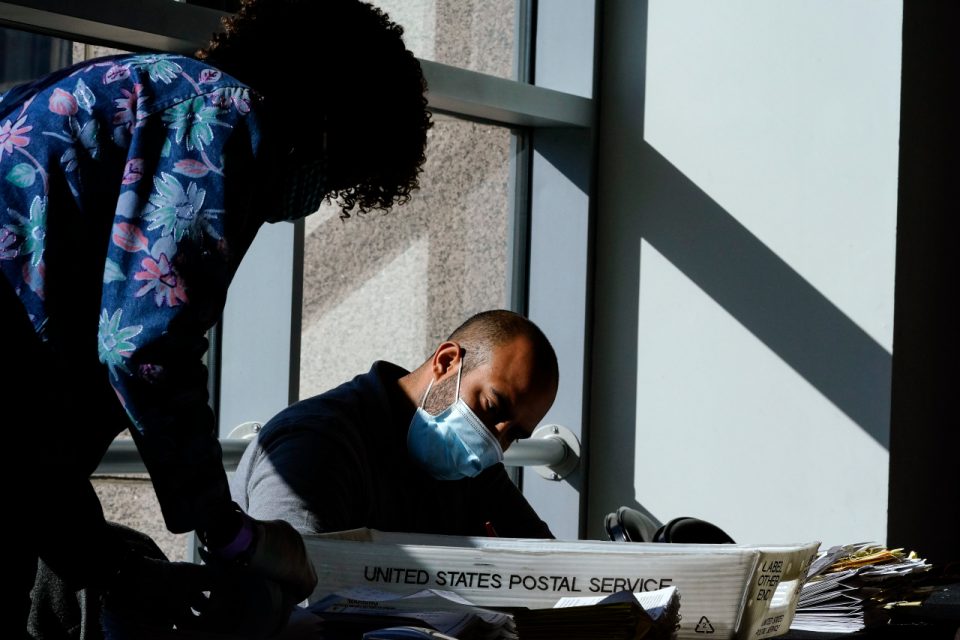 Election workers handle ballots as vote counting in the general election continues at State Farm Arena on Thursday, Nov. 5, 2020, in Atlanta. Election systems in the U.S. are vulnerable to cyber intrusions similar to the one that hit federal agencies and numerous businesses last year and remain a potential target for foreign hacking, according to a report released Wednesday, Feb. 10, 2021. (AP Photo/Brynn Anderson, file)