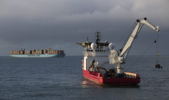 Photograph: The Geosund salvaging ship lifts a container from the seabed off the northwestern coast of the Netherlands on Monday, Jan. 21, 2019. Dutch authorities say a freight ship lost dozens more containers than previously thought when it was caught in a heavy storm on Jan. 2 when at least 345 containers fell off the MSC Zoe. Photo credit: AP Photo/Peter Dejong.
