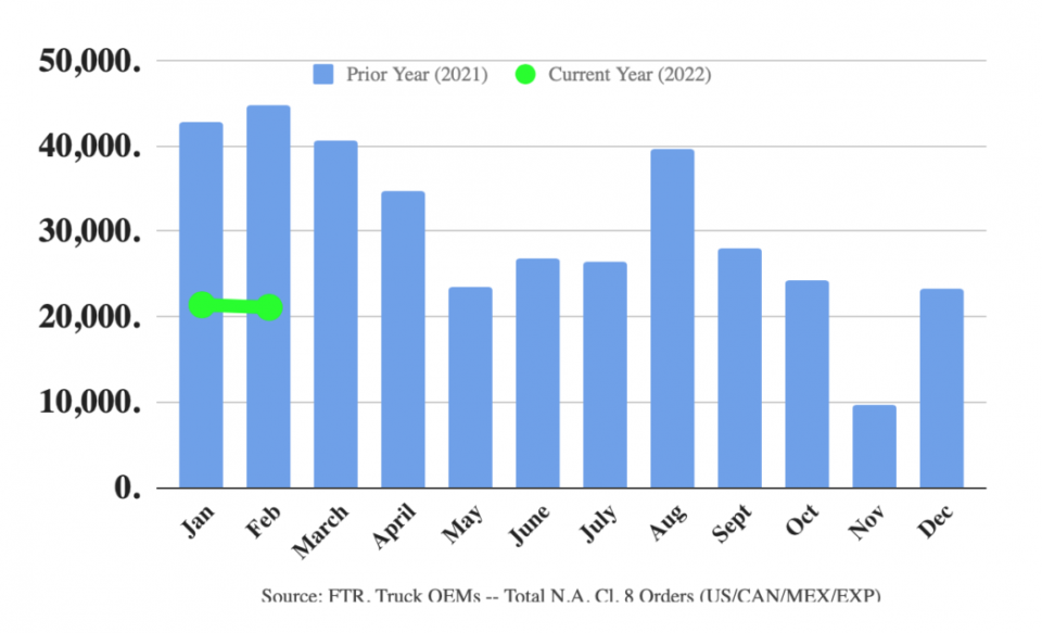 Those figures were similar to a report from another firm, Columbus, Indiana-based ACT Research, which found that preliminary NA Class 8 net orders in February were 21,000 units.