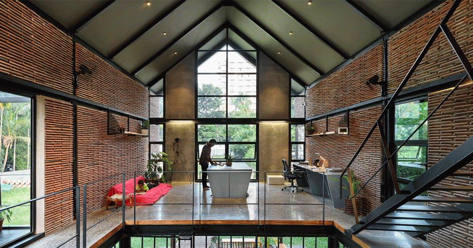 In the heart of Kochi, India, architect Koshy P. Koshy built the ‘Koshish’ residence by repurposing old mangalore tiles, steel, and windows sourced from a run-down textile factory, 8 kilometers away. The design integrates a minimalistic mixture of industrial materials and open spaces throughout to create a sense of oneness with the surrounding nature. The result sees a permeable structure that with elevated columns, pivoted glazing, and terracotta-tiled walls, blurring the line between indoors and outdoors, and enriching the entire area and its occupants.