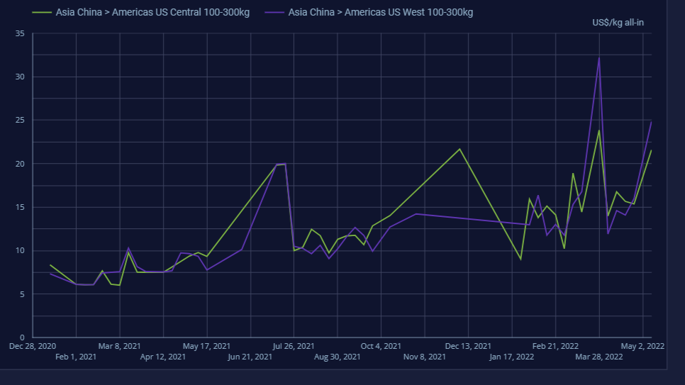 Spot rates from China to the U.S. West Coast and Midwest have nearly doubled since early April to more than $20 per kilogram because of extensive flight cancellations into China, according to the Freightos Air Index.