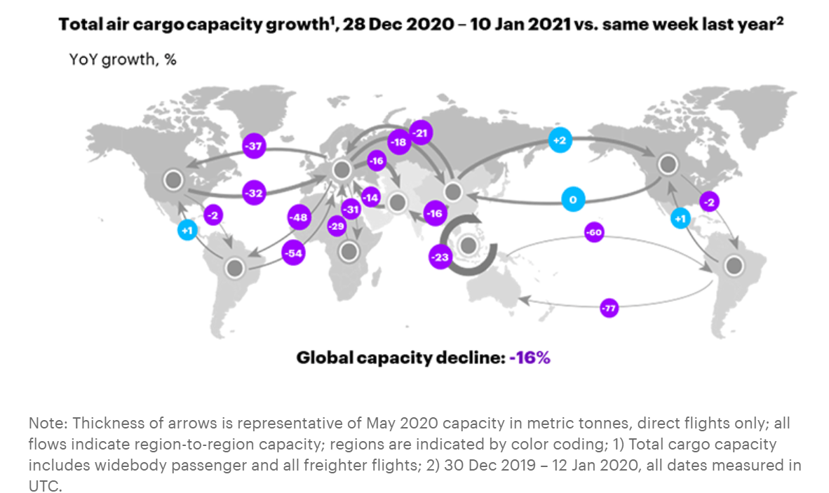 Nearly 40% of available airlift disappeared last April, but by the end of 2020 the year-over-year gap was halved as passenger airlines selectively added flights and all-cargo carriers operated more aircraft and flights.