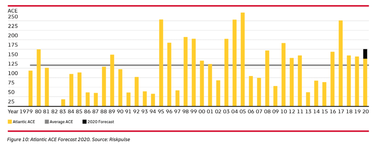 Riskpulse forecasts an ACE score, which stands for Accumulated Cyclone Energy, of 125 to 150 for the 2020 Atlantic hurricane season, above 2018 and 2019 levels.