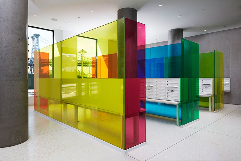 commissioned by two trees management, color artist robert swain installed his first glass project ‘color sensation cube’ at the lobby of the residential domino sugar factory site in williamsburg, brooklyn. inspired by the structure of sugar crystals, the eight foot tall installation comprises transparent glass panels in nine different hues. the project is built around the resident mailboxes and covers a total of 325 square feet. depending on the viewer’s perspective and time of day, the panels create a dynamic range of color combinations and reflections.